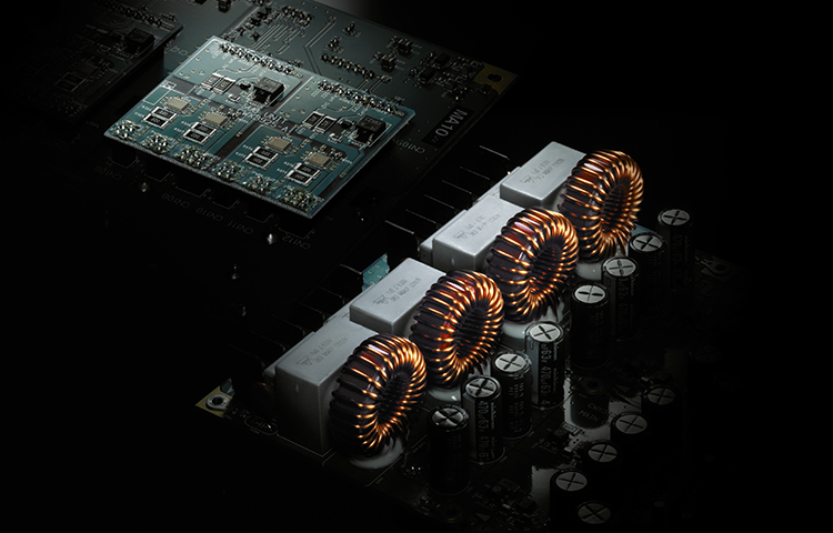 応答性が高くしなやかで力強い音質へ貢献するとともに、余裕をもってトータル500W(250W/4Ω×2ch) のパワーをドライブする高い出力性能を備えています。