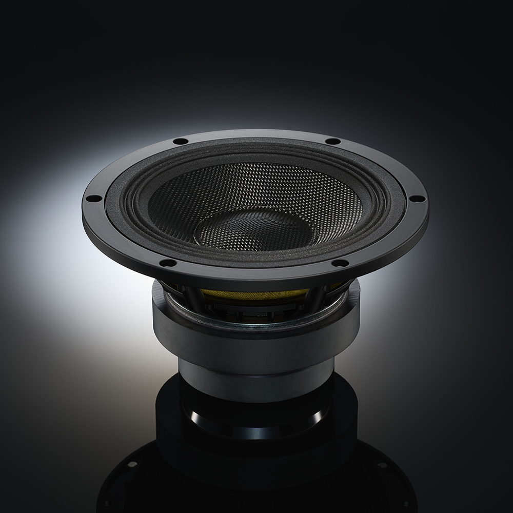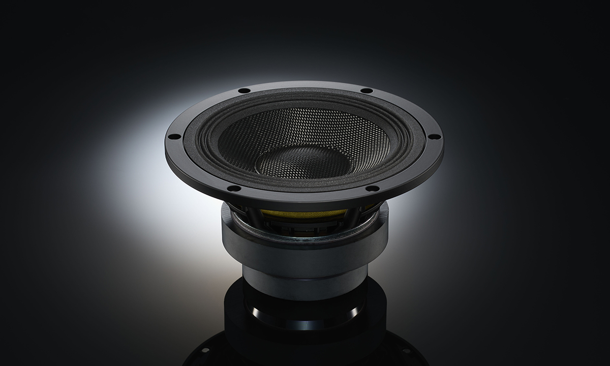 ウーファーに、アラミド織布と異素材の不織布をラミネートした「MACC振動板」を採用することで、豊かでクリアな低域再生とカラレーションのない素直な中低域再生を実現しました。また、LDMC (Linear Drive Magnetic Circuit) を搭載した磁気回路をブラシュアップして駆動力とそのリニアリティーを高めるとともに、発泡ポリカーボネートのコルゲーションエッジによる支持系の高いリニアリティーにより、歪みのないクリアで豊かな低音を再生します。さらに、ウーファーフレームも強力でリニアな駆動力を受け止めるようアーム部の形状を見直し、強度アップとスムーズなエアフローを実現しています。