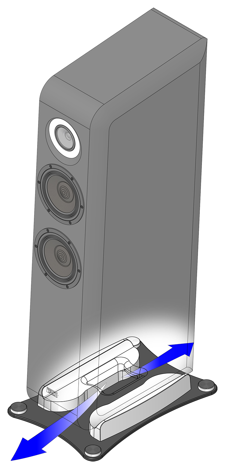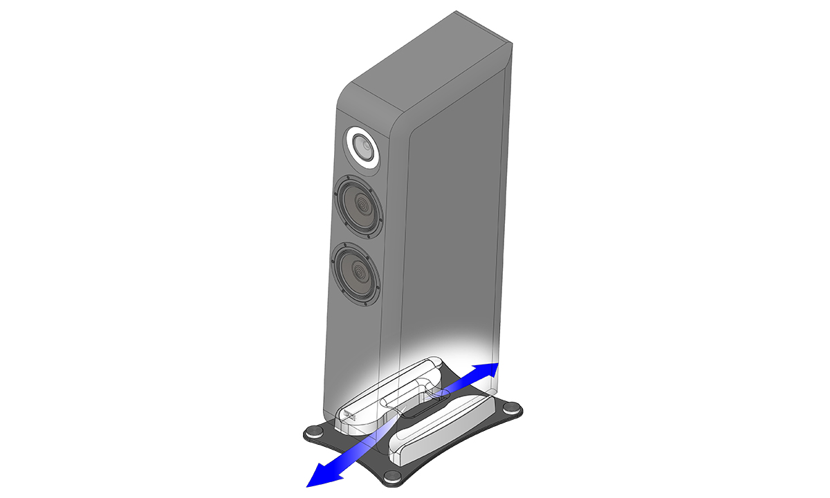 エンクロージャーの底部にポートを配置し、開口部を前後へレイアウト。そのポート内部をホーン形状とすることで、ポートノイズを低減した効率のよいポート駆動が可能になり、クリアでレスポンスのよい中低音を実現します。また、ポートフレアにはアルミダイキャストを使用するとともに、ポートを前後の対称レイアウトにすることで、エンクロージャーを振動させる力を打ち消し、豊かで力強い低域を再生します。さらに、10mm厚の鋼板製ベースプレートを採用することで、安定した設置を可能にし、強力な駆動力を持つウーファーのリアクションをしっかりと受け止めます。