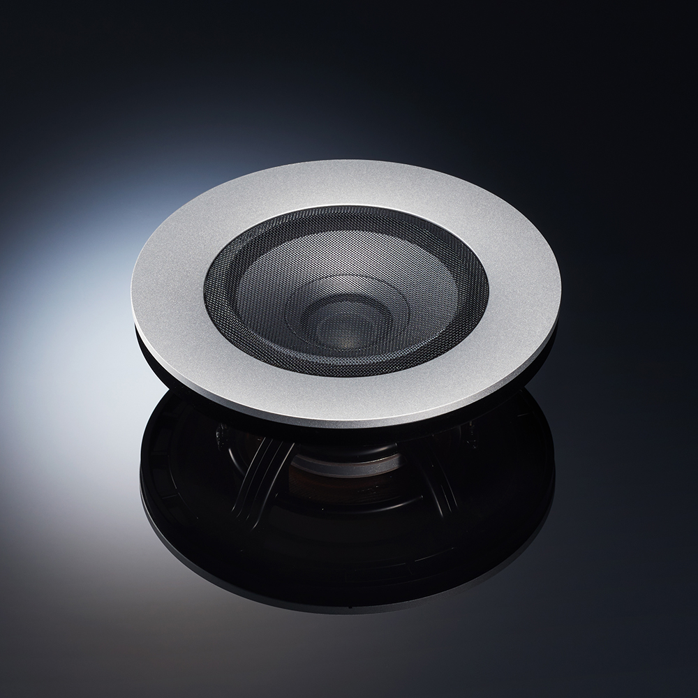 ミッドレンジに、軽量かつ内部損失の高いマグネシウム合金を用いた振動板を採用。新たに、陽極酸化処理と塗装による複合処理を施して表面硬度のさらなる向上と損失付加を図るとともに、ボイスコイルからのリード引き出し部のわずかな共振を抑えることで、歪みの少ない澄み切った中音を実現しています。また、磁気回路を抱えるフレームバスケットのアーム部の形状を見直し、大幅な強度アップとミッドレンジ背面におけるスムーズな音波の伝搬を実現しています。